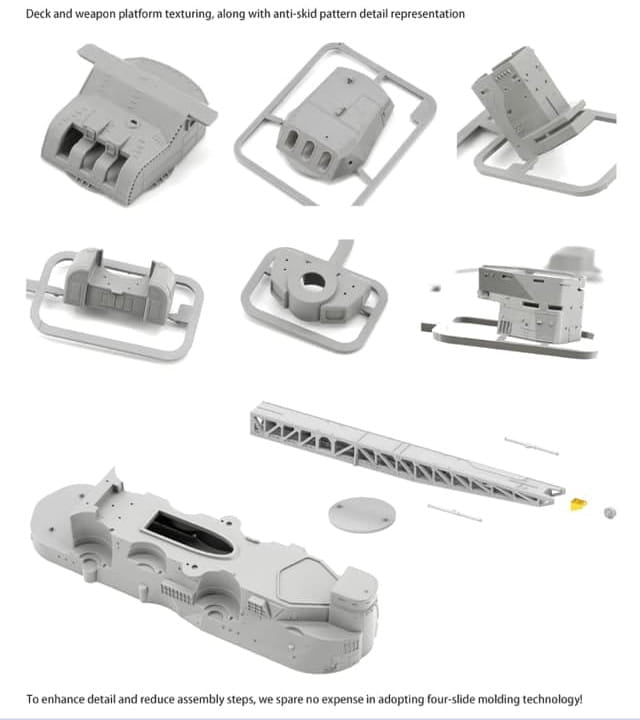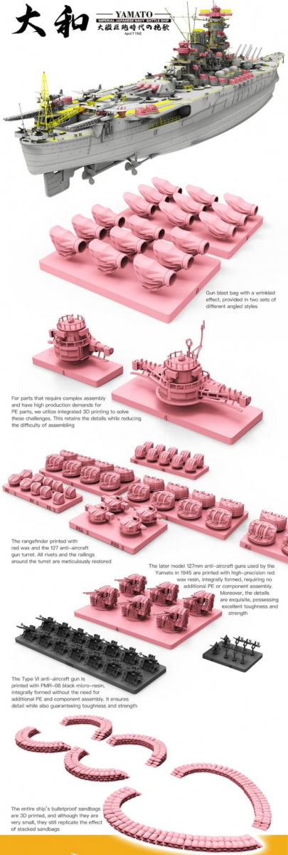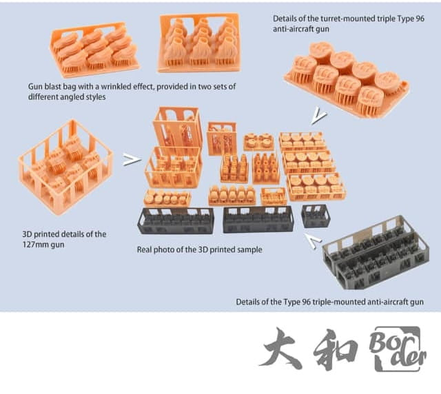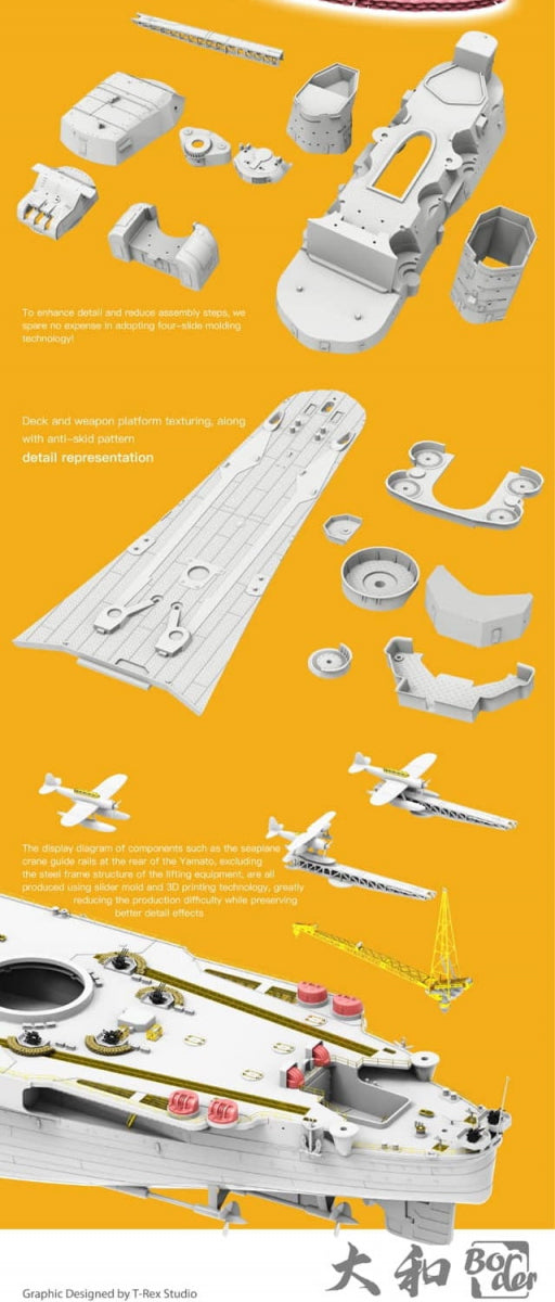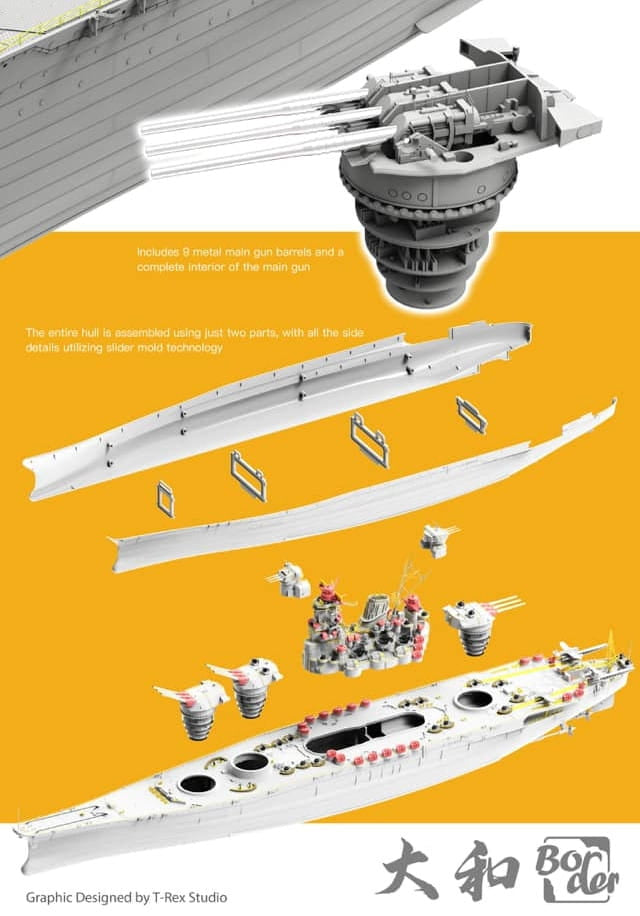 Border Models announced this completely new-mold 1/350-scale model kit of the legendary Imperial Japanese Navy battleship Yamato at the 62nd Shizuoka Hobby Show! This next-generation ship model reproduces her final appearance in 1945, and is equipped with cutting-edge slide-mold technology, 3D-printed parts, and photo-etched parts! Decals and a metal gun barrel are also included. The three main gun turrets with their complete internal structure are reproduced based on the latest research. The hull is made with a four-sided slide mold, and the bridge and various other structures are also extensively slide-molded to minimize the number of parts. The 3D-printed parts are easy to assemble, too; 3D-printed parts include the Type 96 anti-aircraft machine gun (can be built with or without canopy), 127mm high-angle gun (can be built with or without canopy), turret with blast bag, rangefinder, waterproof cloth, rails for transporting seaplanes, bulletproof mantlet and more!