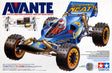 In March 1988, Tamiya released an electric R/C 4WD racing buggy called the "Avante" and it has since become a special machine in Tamiya's R/C history. The machine featured a unique shaft-driven 4WD system which was taken from Tamiya's first 4WD R/C buggy, the Hotshot. It also featured a highly sophisticated design including a FRP double-deck chassis layout, longitudinal motor & battery positions, and a formula-type body with chassis fairing. It was equipped with innovative components such as a compact gearbox with 3 small planetary gears, a center diff to increase stability, a fully adjustable suspension, and cam-lock wheel caps.