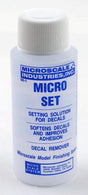 Micro Set is a very versatile decal setting solution that does several things to decals to improve application. Micro Set should be applied to the surface of the model where you will be sliding off the decal. Micro Set prepares the surface with special wetting agents that cuts the oils in new paint and converts the adhesive on the back of the decal to a stronger and more lasting one. And finally, Micro Set slightly softens the decals film to make it more flexible so that it can conform better to the model's surface. Better adhesion by the decal to the model prevents tiny air bells from occurring and results in an invisible carrier film or the "painted on look".