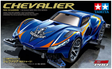 This is a plastic model assembly kit of a four-wheel drive racer with high performance and fun racing. The CHEVALIER, which means "knight" in French, is a machine that synchronizes the form of a midship lightweight sports car with the image of a medieval knight. The most eye-catching features are the left and right front fenders, which protrude strongly with sharp edges. Combined with the low and wide sporty styling, it produces aggressive driving. In addition, the chassis uses MA, which is easy to assemble and has high strength, and small-diameter low-height tires are attached to silver Y-spoke wheels. The orange graphics, headlights, and carbon pattern on the roof that accentuate the dark blue body are expressed with metallic stickers.