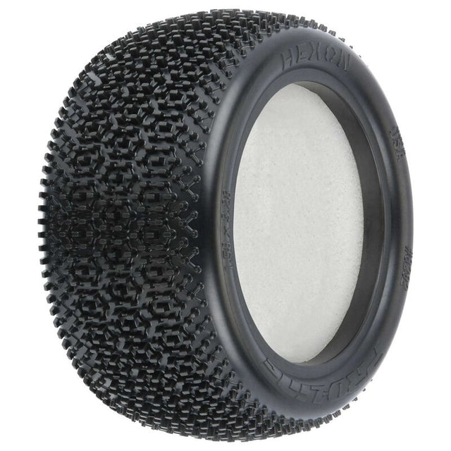 Introducing the all-new Pro-Line Hexon Carpet Buggy Rear race tire! The Hexon features a hexagon pattern of uniquely shaped pins that provide longer-lasting tread and more consistent performance than previous generation carpet tires. Just like the Prism 2.0, the Hexon features a low profile tire carcass shape that lowers your car's center of gravity for improved corner speed. The Hexon pins are positioned with the flat edge pointed front to back for maximum forward grip and are narrow when viewed from the side to reduce traction rolling. This new tire also features a directional side tread so you can tune the performance of your tires to the current track conditions. You can choose to mount the standard pins on the outside for a more aggressive grip, or mount the vertical side pins to the outside for a more forgiving grip. The Hexon tire is another leap forward in the hot carpet racing scene; be the first with the fastest carpet tire yet - Pro-Line's new Hexon!