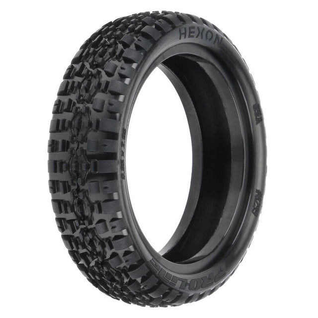 This is a pair of Hexon 2.2" 2WD Front Carpet Buggy Tires. Introducing the Pro-Line Hexon 2.2" Carpet 2WD Front race tire! The Hexon front tire features a hexagon pattern of uniquely shaped pins combined with Wedge style outer pins that provide longer-lasting tread and more consistent performance than previous generations of carpet tires. The Hexon front features a low-profile tire carcass shape that lowers your car's center of gravity for improved corner speed due to consistent sidewall flex. The Hexon pins are pointed front to back for maximum control in the corners providing the direct feel carpet racers crave. The Hexon front tire is another leap forward in the hot carpet racing scene; be the first with the fastest carpet tire yet - Pro-Line's Hexon Front!