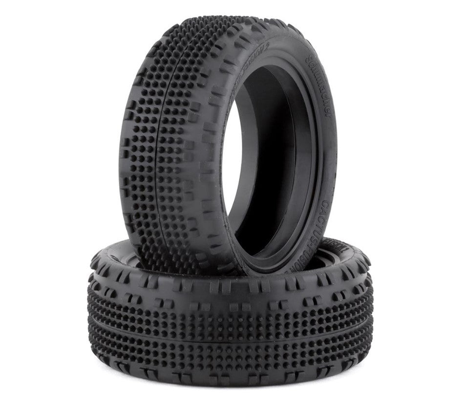 The Schumacher Cactus Fusion 2 2.2" Front 1/10 4WD Tires are based on the highly successful Cactus Fusion. The tire has a larger diameter, similar to diameter of the rear tire, and features an improved fit to the wheel for easier gluing. On the track they will be more forgiving on landing and in bumpy conditions. Package includes two front tires.
