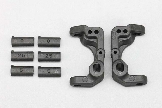 GRAPHITE MOLDED STEERING HUB CARRIER FOR YZ-2 DTM3.1/CAL3.1. THE KINGPIN POSITION HAS BEEN CHANGED TO THE FRONT, AND THE SHAPE HAS BEEN CHANGED TO ATTACH THE STEERING STOPPER. IT USES GRAPHITE RESIN WITH HIGHER HARDNESS THAN THE STANDARD, AND THE STEERING RESPONSE IS IMPROVED.