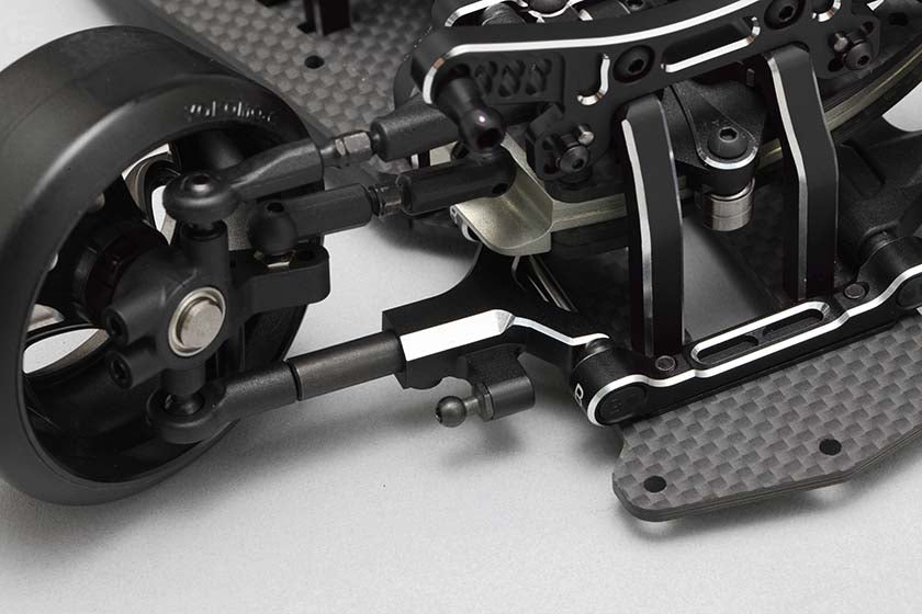 An aluminum front lower A arm set that can be used with the YD-2/YD-4 series. By shortening the arm length even further than the resin short arm and eliminating the interference with the wheel, the cutting angle is further increased and it is possible to run at a deeper drift angle. It also has the effect of improving the ground contact feeling at the front by increasing the weight and improving the steering response by increasing the rigidity.