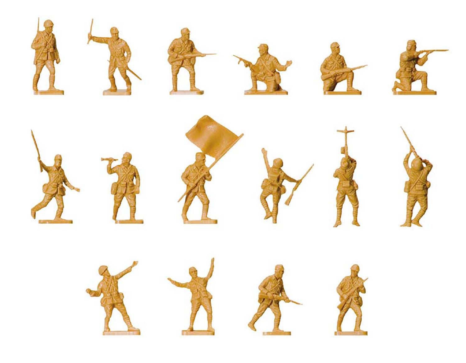 Accurately modelled on the Japanese army in the pacific, this set of figures includes officers handling swords, a Bugler and infantrymen with rifles, sub-machine guns and grenades.