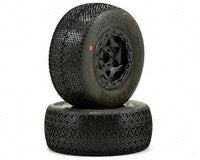 This is a set of two AKA Racing Pre-Mounted Wishbone Short Course Tires in Super Soft Compound, with Red Inserts. These tires are used on the front of the Traxxas Slash. The WISHBONE SC is suited to the high bite blue grooved clay tracks or indoor clay tracks. The tread design features a low profile tread pattern to keep lug squirm to a minimum on high bite surfaces. All AKA SC tires feature the industry standard 2.2/3.0 bead sizes. Mark and Gil have designed an innovative inner carcass design made to perfectly fit the industry standard AKA 1:8 buggy closed cell foams. This results in a much more controlled outer sidewall for more consistent handling and tread wear. No more cranking in tons of camber to keep the tire patch flat on the ground.