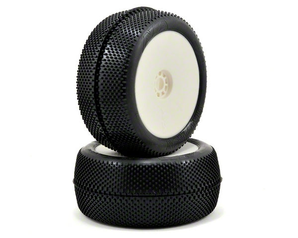 This is a set of two AKA Racing EVO Grid Iron 1/8 Truggy Tires in super soft compound, pre-mounted on white EVO wheels. The Gridiron tire is designed for tracks that are hard packed and or tracks with little dust. This tire design is a great outdoor or indoor alternative. The square outer pins and bar center pins allow for great traction and long tire life compared to other small pin tires. The EVO version of the Gridiron has been revised with more tread density for better performance and wear characteristics.