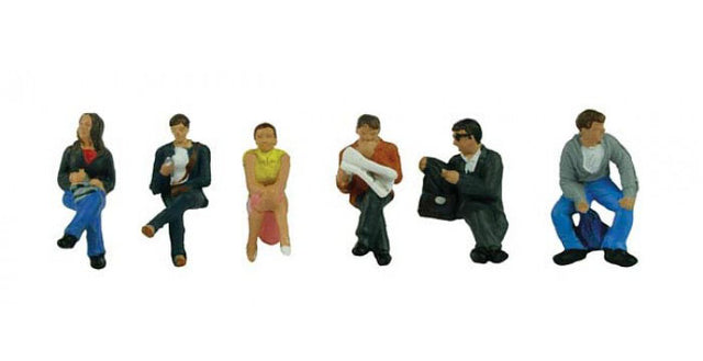 Set of 6 seated passengers to suit OO gauge model railway layouts or small scale (1:76) dioramas.
